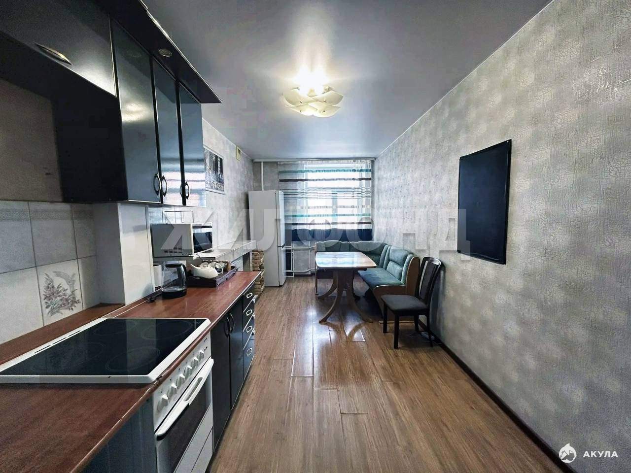 Современный комфорт- На полу уложен практичный и стильный ламинат, а натяжные потолки добавляют интерьеру завершенности и эстетики.